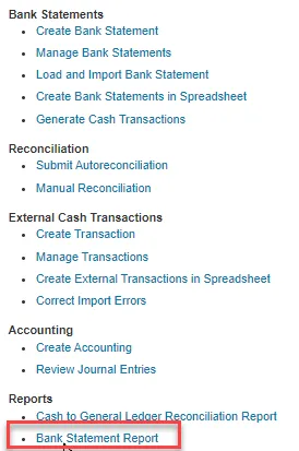 • In the Overview screen, use the task list to run the Bank Statement Report under the Reports section.