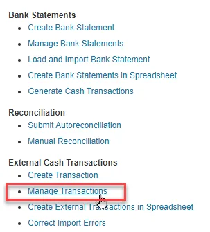 Step 1.    Click on Manage Transactions from the task list under External Cash Transactions.