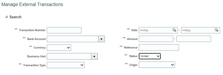 Step 2.    On the Manage External Transactions page, select the following search criteria from dropdown choice lists: