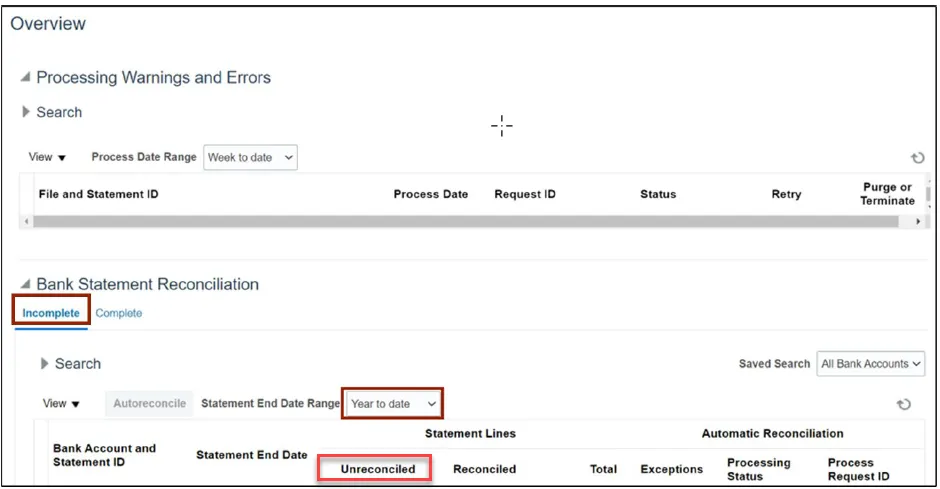 From the Overview page, click on the Incomplete tab within the Bank Statement Reconciliation section.