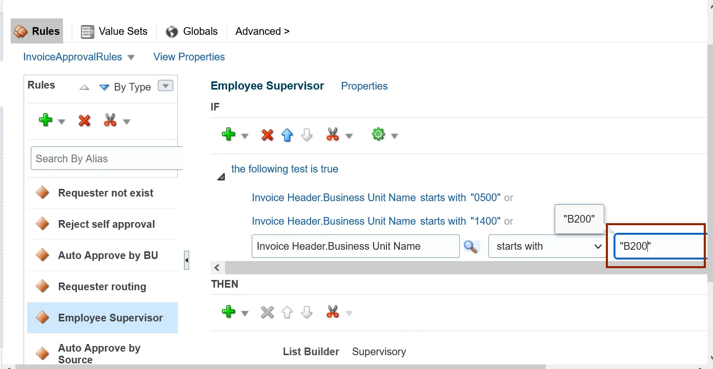 In this example, we choose Invoice Header.Business Unit Name starts with “0500”.