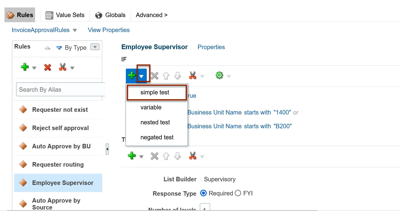 Step 15. Select the simple test option from the drop-down choice list of Advanced Add or Modify Options to add a new condition in the existing approval rule.