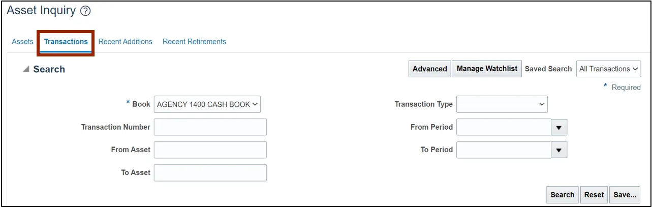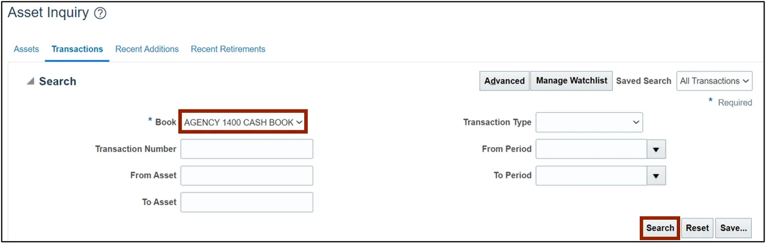 View assets and asset transactions through a basic or an advanced search using the steps above.
