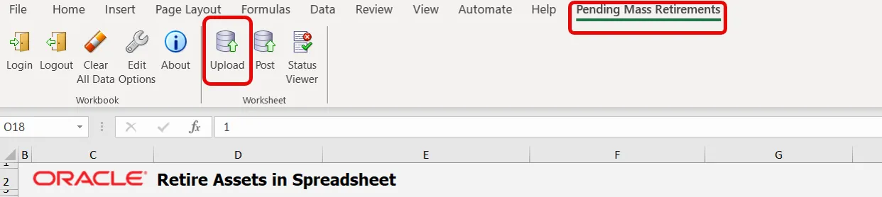 Step 10. On the excel banner, navigate to Pending Mass Retirement (name will change based on transaction type). Click Upload. Confirm in NCFS that the transaction line has been removed from your Fixed Assets Dashboard.