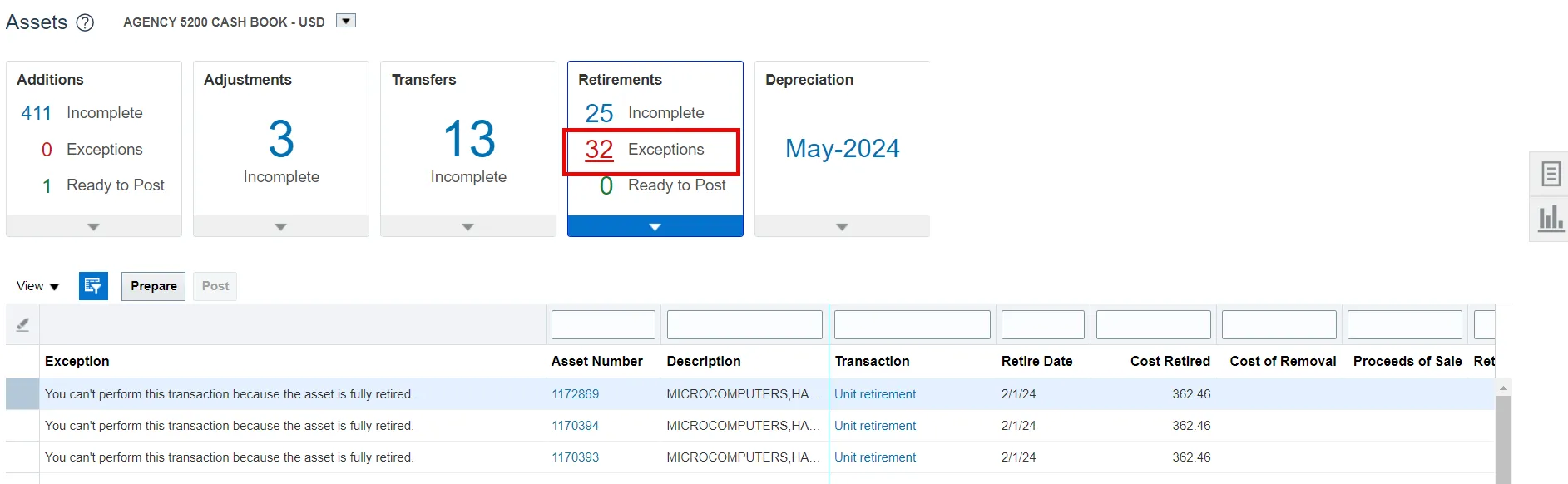 Step 3. In this example, the removal of a Retirement Exception line will be presented. This process can be followed for any transaction type or line. On the Assets page, click Exceptions within the Retirements tile.