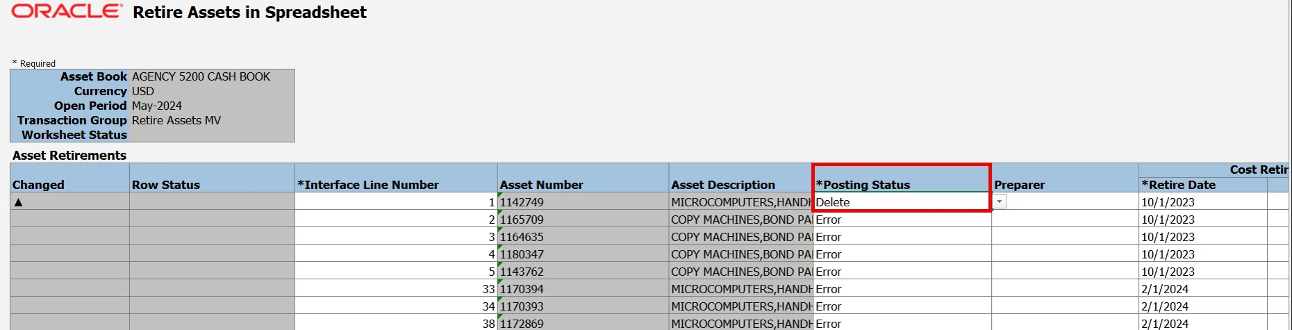 Step 8. Find the line to be removed. Change its Posting Status to Delete by using the drop-down list.