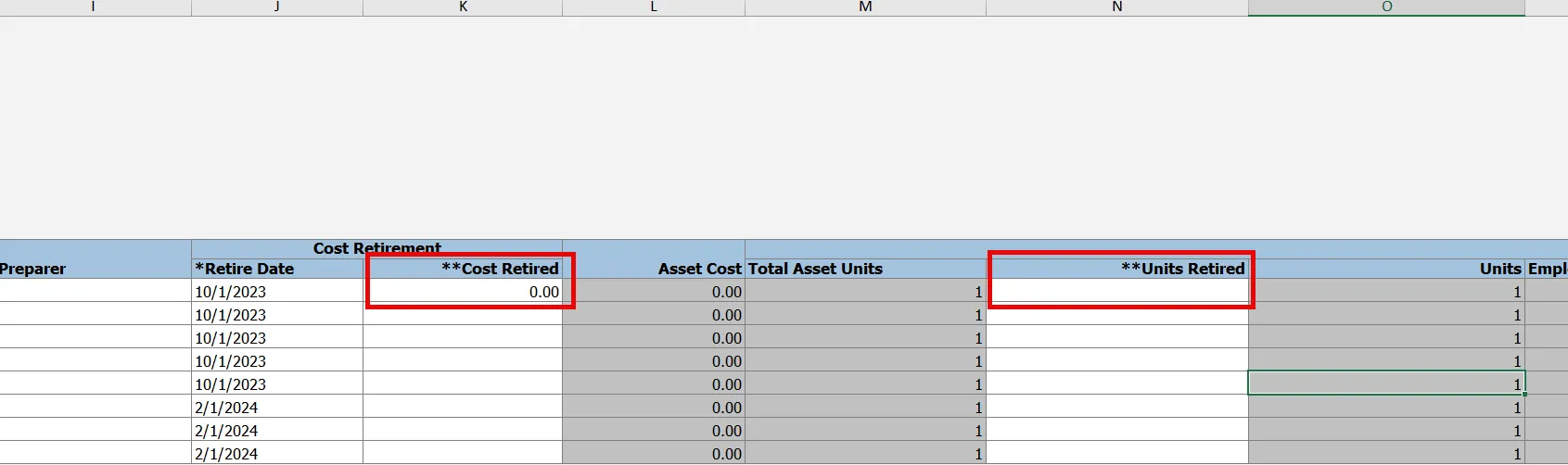 Step 9. For retirement exception transactions, set the Cost Retired (Column K) to be equal to the Asset Cost (Column L). Ensure the Units Retired (Column N) is left blank. Ensure Retire Date (Column J) and Retirement Convention (Column Y) are filled with accurate data.