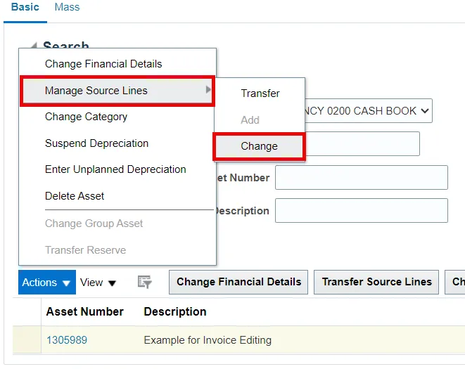 Step 5. Select the asset record (click the description and have the line highlighted). Then open the Actions drop-down list.