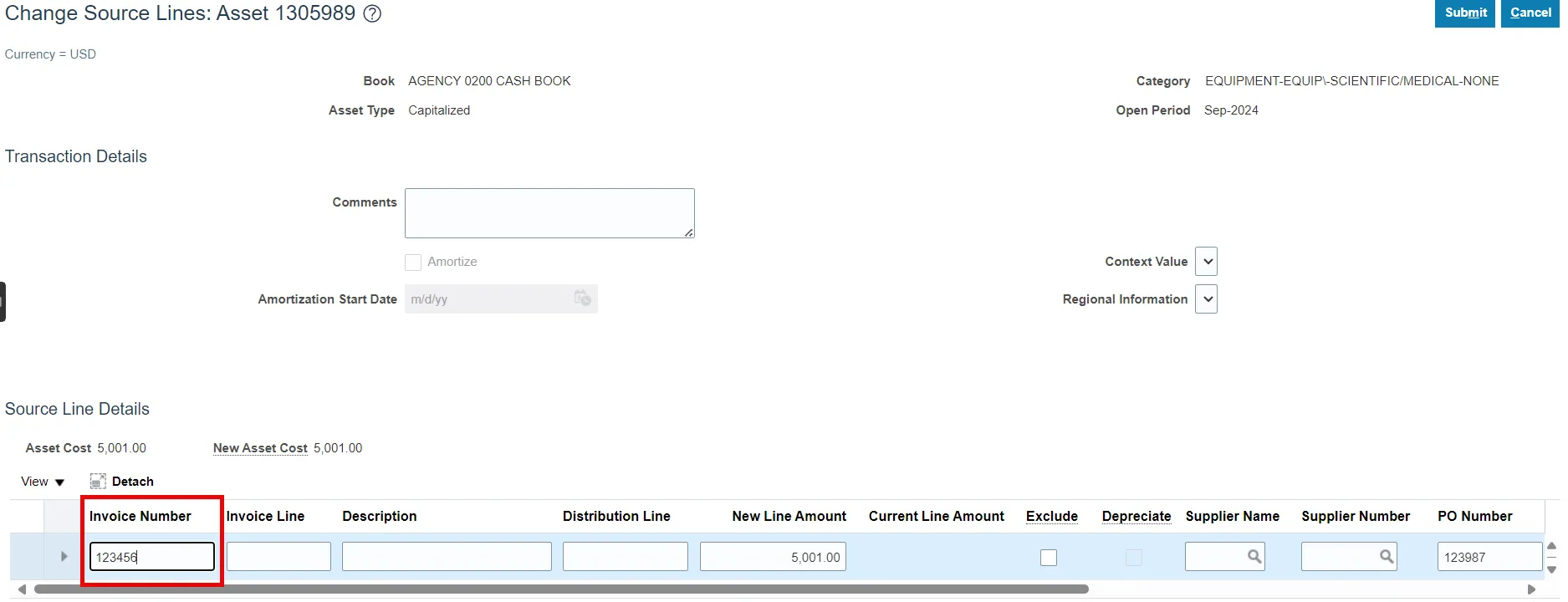 Step 7. The Change Source Line page will appear. On this page, edit or enter the Invoice Number as necessary. Click Submit when finished with your updates. You have successfully updated this asset record’s invoice number.
