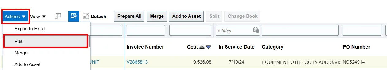 To edit an invoice number on a fixed asset record, please follow the steps below. There are 7 steps to complete this process.