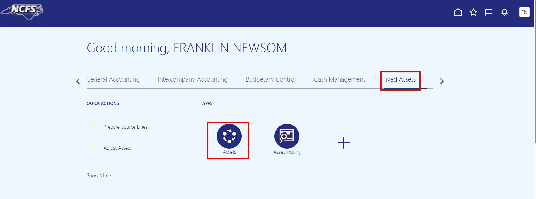Step 2.    On the Home page, under the Fixed Assets tab, click the Assets app.