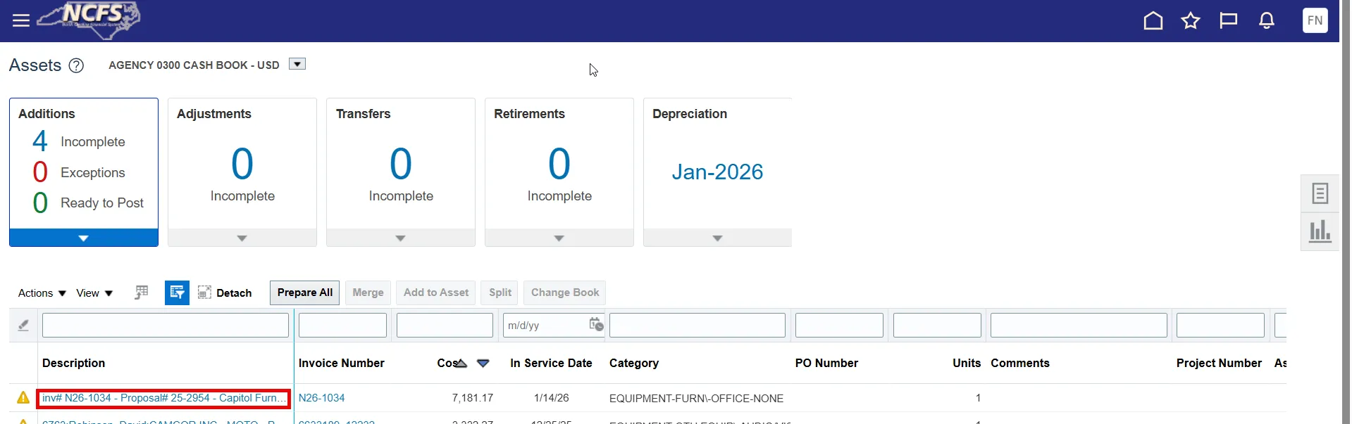 Step 3.    On the Asset Dashboard page, within the Additions tile, locate your source line or manual addition line.  Click the description hyperlink to open the Edit Source Line (or Edit Asset) page.