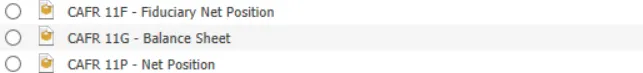 The Fiduciary structure is used to generate the CAFR11F Fiduciary Net Position and the CSFR54F Change of Fiduciary Net Position.  The structure is used for the following GASBs: