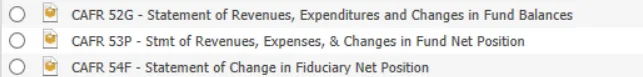 The Governmental structure is used to generate the CAFR11G Balance Sheet and CAFR52G Revenues and Expenditures reports.  The structure is used for the following GASBs: