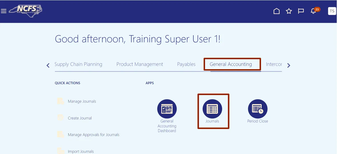 Step 2. On the Home page, click the General Accounting tab and select the Journals app.