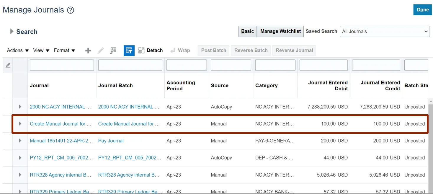 Step 8. The Manage Journals page will change in appearance, with the search criteria collapsed and the search results displayed. Click the Journal name to view journal.
