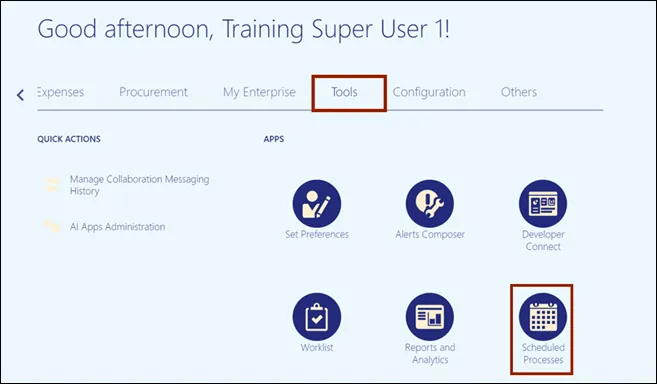 Step 2. On the Home page, click the Tools tab and click the Scheduled Processes app.
