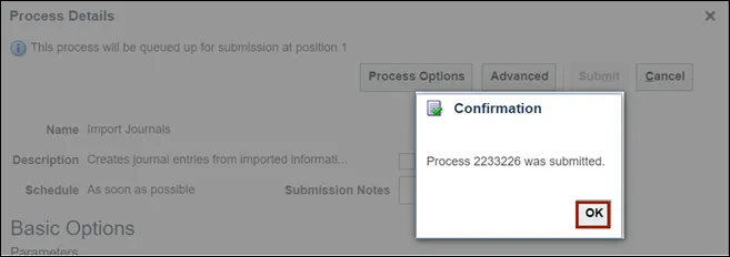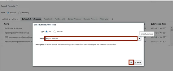 Step 4. The Schedule New Process pop-up appears. Enter Import Journals in the Name field and click OK button, or use the drop-down choice list to find the process Name.