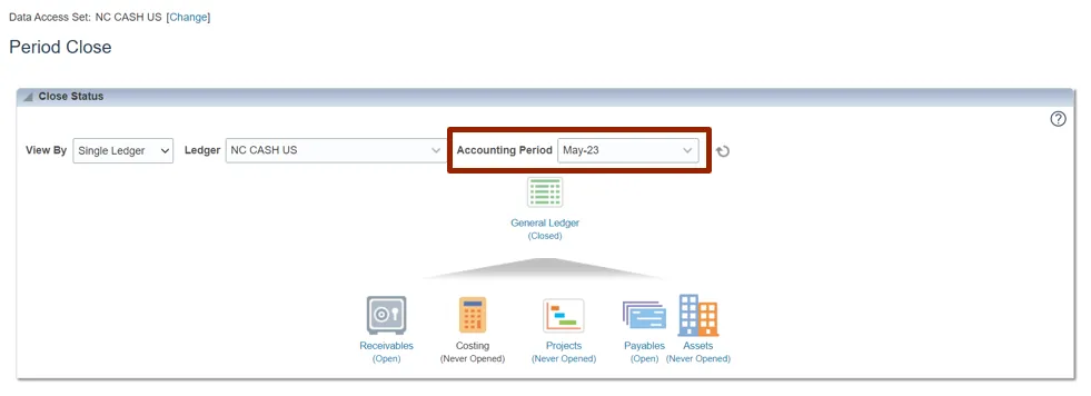 Step 4. On the Period Close Dashboard, click the Change button next to Data Access Set to change access set. In this example, choose NC CASH US.