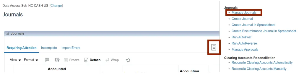 Step 3. The Journals page opens. Click the Tasks icon and select Manage Journals.
