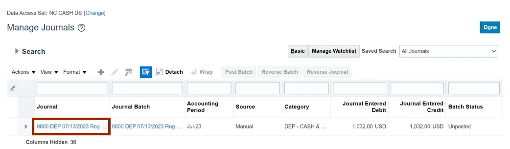 Step 7. Scroll down and validate the Journal details (For e.g., Ledger, Category and Journal Lines (for e.g., Account segment values, and DFF bank account field for deposits).