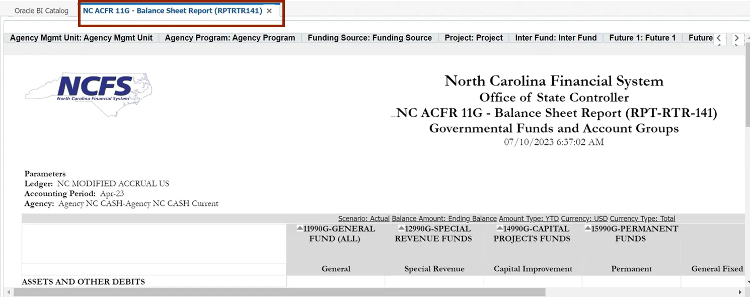 In this example, we choose NC ACFR 11G Balance Sheet Report (RPTRTR141).