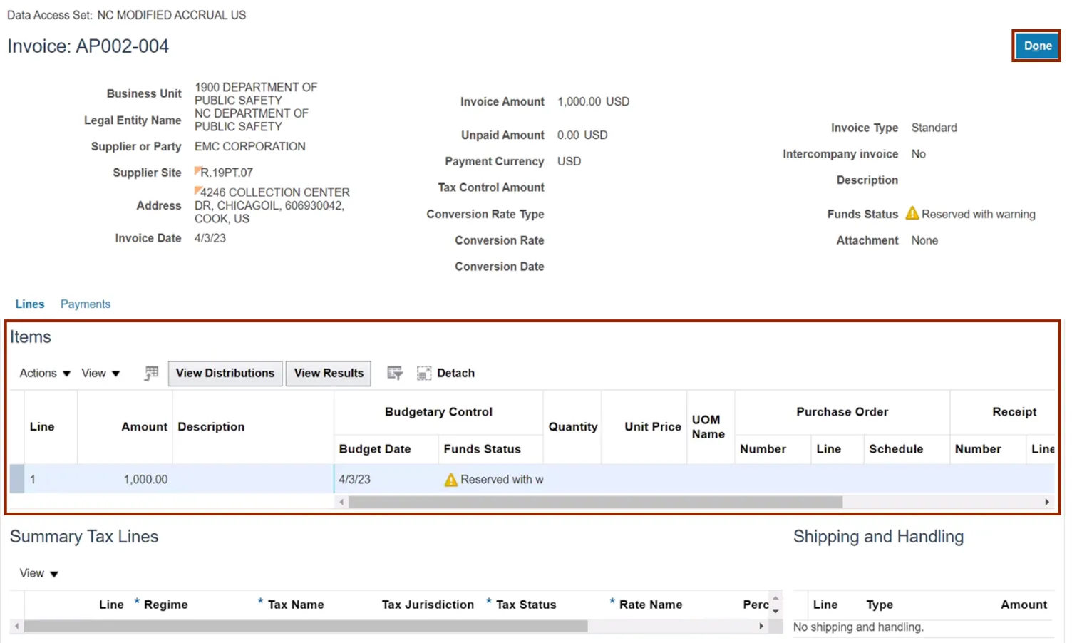Step 10. The Invoice page opens. Review the details and click the Done button.