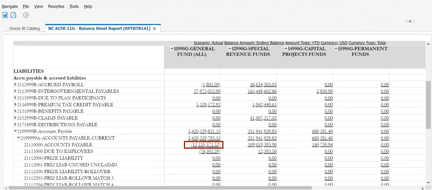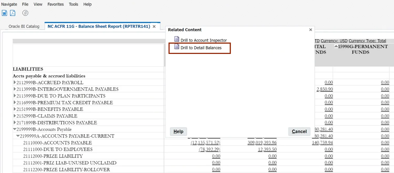 Drill down to detailed balances on FRS reports, like the ACFR 11G-Balance Sheet Report (RPTRTR102), using the steps above.