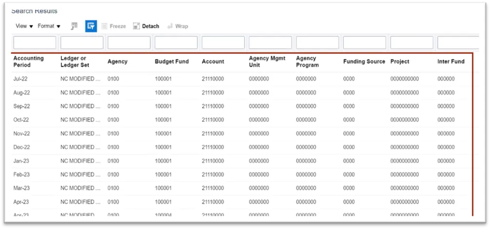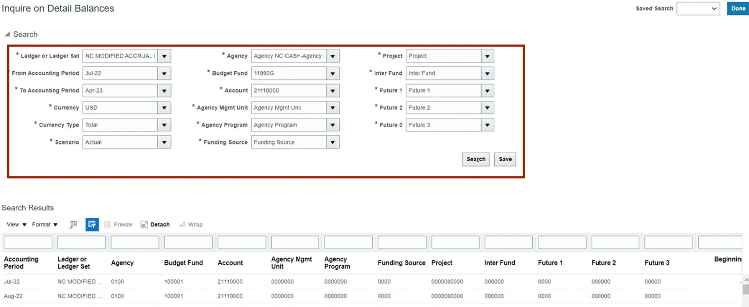 Step 4.    The Inquire on Detail Balances page opens, with the search parameters populated and the search results already displayed.