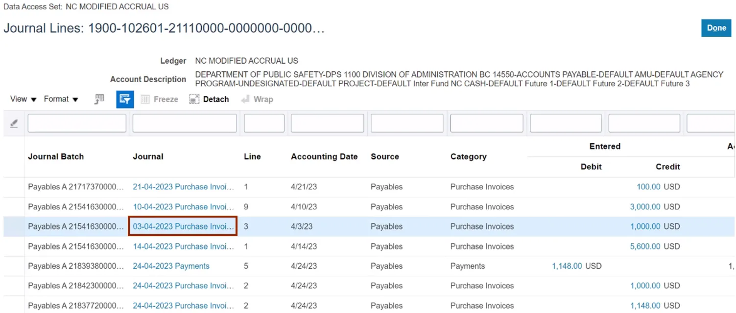Note: The Debit and Credit values will be available for further drill down only if the journal batch Source is one of the Oracle subledgers, such as Payables or Assets.