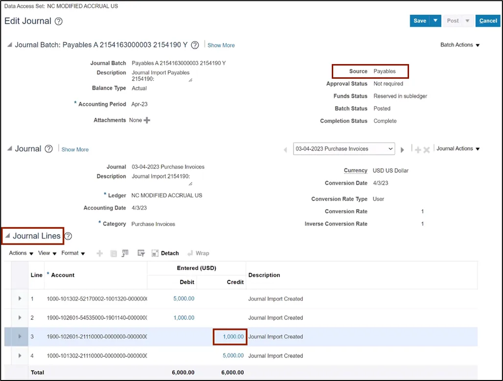 Step 8.    On the Edit Journal page, scroll down to Journal Lines section and click the Credit amount to view the Subledger details.