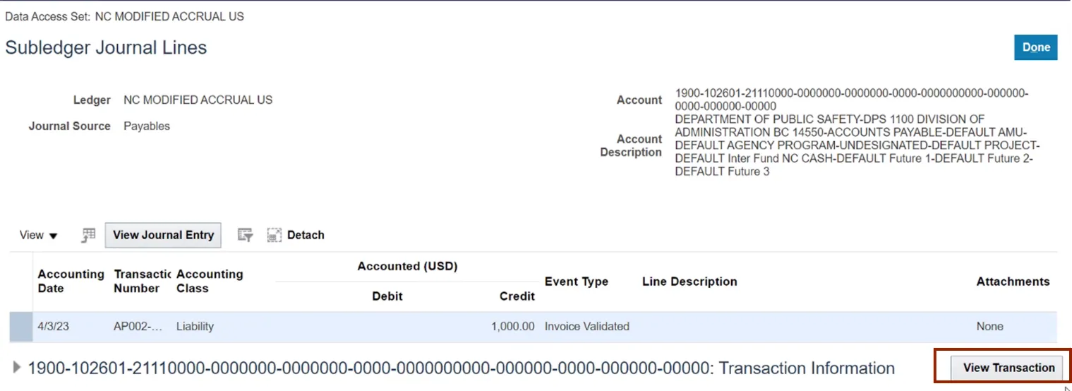 Step 9. The Subledger Journal Lines page opens. Review the details and click the View Transaction button to view the transaction details.