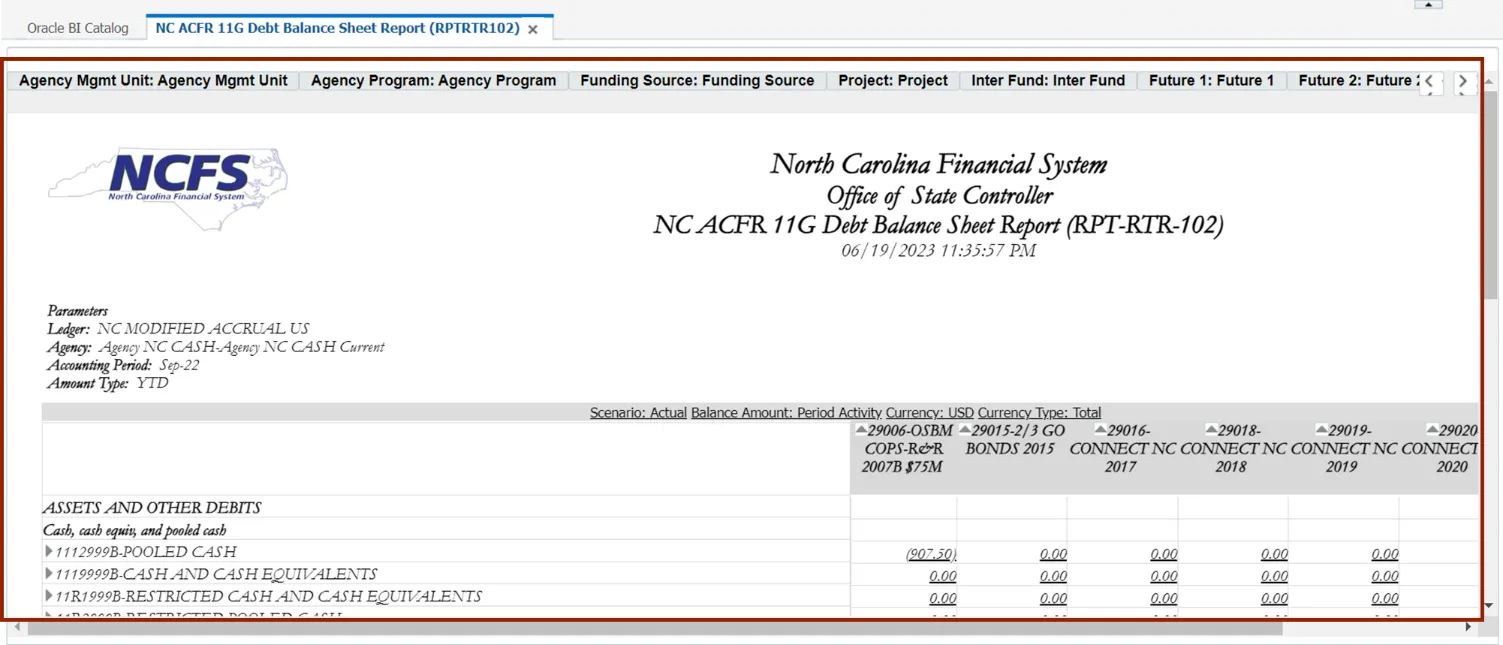 Step 13.    The NC ACFR 11G Debt Balance Sheet Report (RPTRTR102) is displayed.