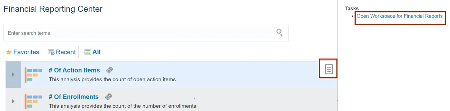 Step 3.    The Financial Reporting Center page is displayed. Click the Tasks icon and click Open Workspace for Financial Reports.