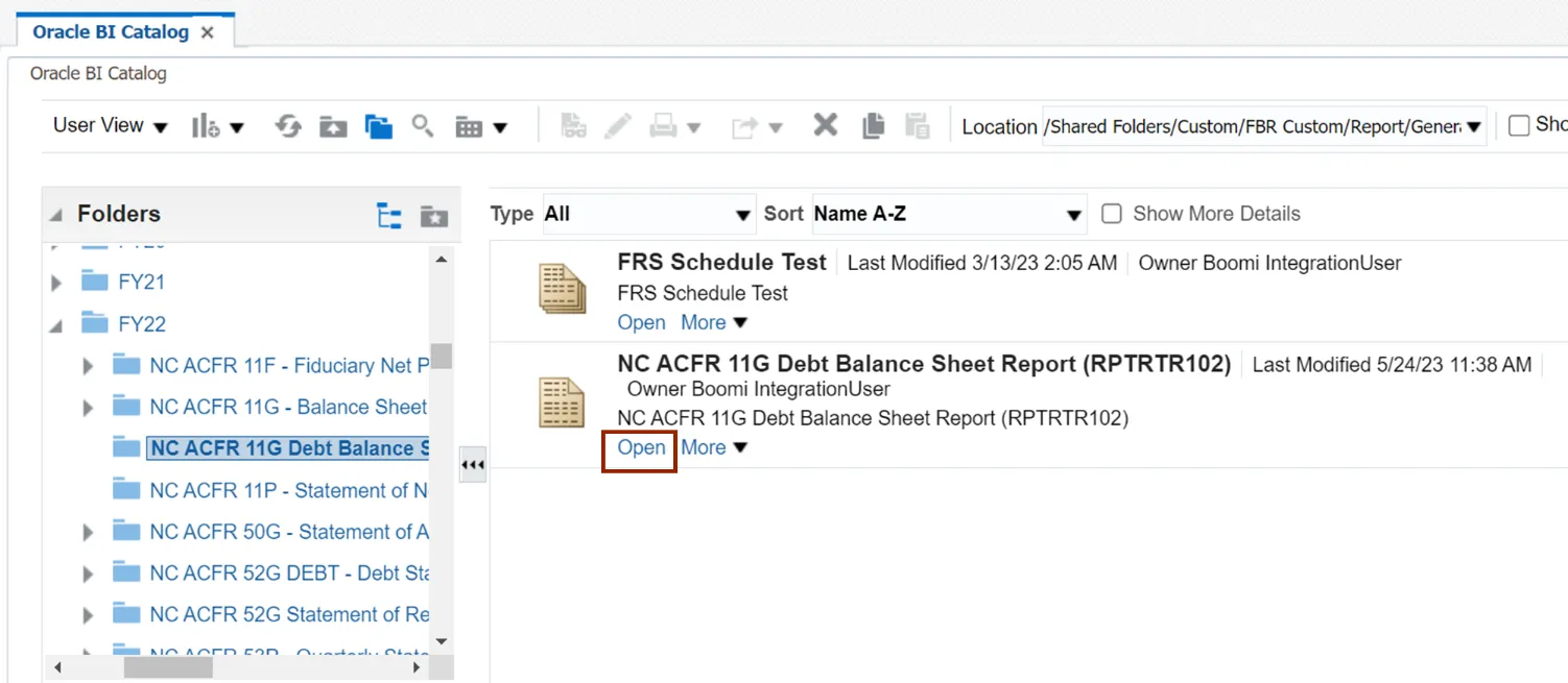 Step 9.    On the NC ACFR 11G Debt Balance Sheet Report (RPTRTR102), click the Open link.