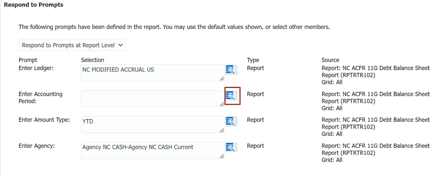Step 10.    The Respond to Prompts pop-up appears. On the Enter Accounting Period field, click the Search icon.