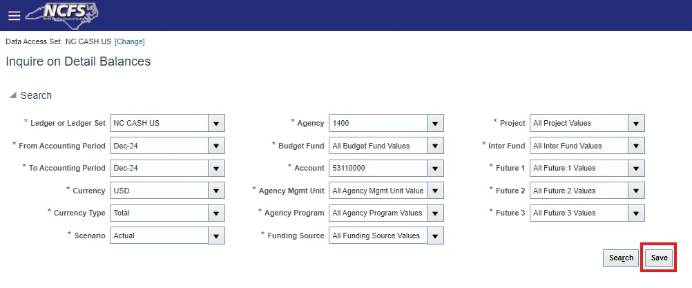 Step 8.    To save search parameters that are frequently used, from the Inquire on Detail Balances screen select Save.