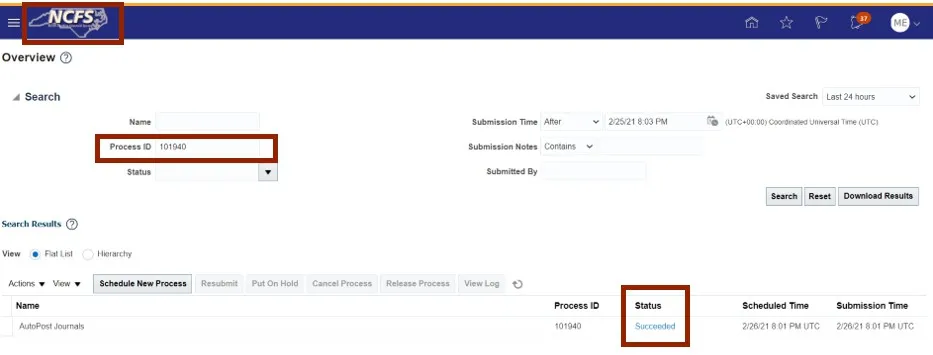 Step 24. Enter the Process ID and confirm the Status field states “Succeeded.” Then click the navigator in the upper left-hand corner of the screen.