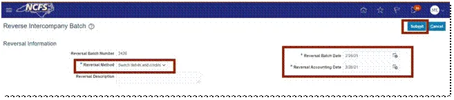 Step 7. Enter the Reversal Method, Reversal Batch Date, and Reversal Accounting Date. Then click Submit.