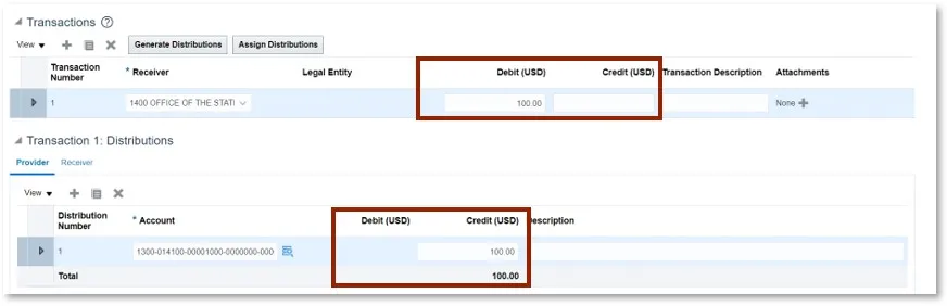 Step 8. Under Transactions, update the Receiver totals by removing the Credit (USD) amount and paste it into the Debit (USD) Field. Under Transactions 1, update the Provider totals by removing the Debit (USD) amount and paste it into the Credit (USD) Field.