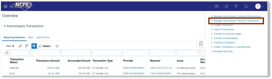 Step 4. From the task list, click Manage Intercompany Inbound Transactions.