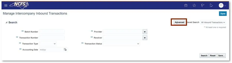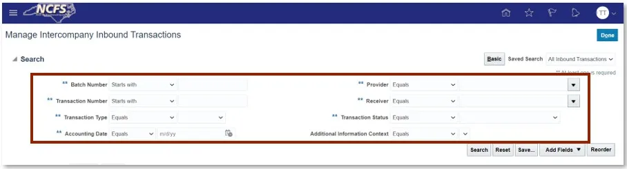 When NCFS users are searching through intercompany transfers, there are four key search capabilities that make the search process efficient. The four sections discussed in this QRG are the Basic Search, Advanced Search, Adding Additional Fields, and Saving Searches. A basic search allows a search on specific values or names. Advanced Searches allow users to set conditional operators to search on portions of fields or ranges, as well as add additional fields to more refine the search. In addition, users may add additional search criteria to Advanced searches to enhance the search. Saved searches allows the user to keep a copy of the search criteria for later use. Users can create new saved search entries, edit, and delete existing saved search entries. Also, the user can retrieve user-specified or public saved search entries.