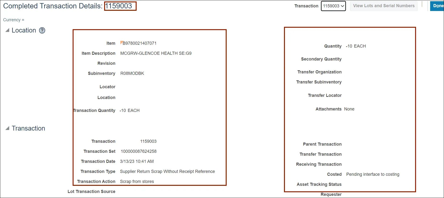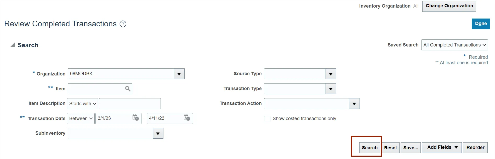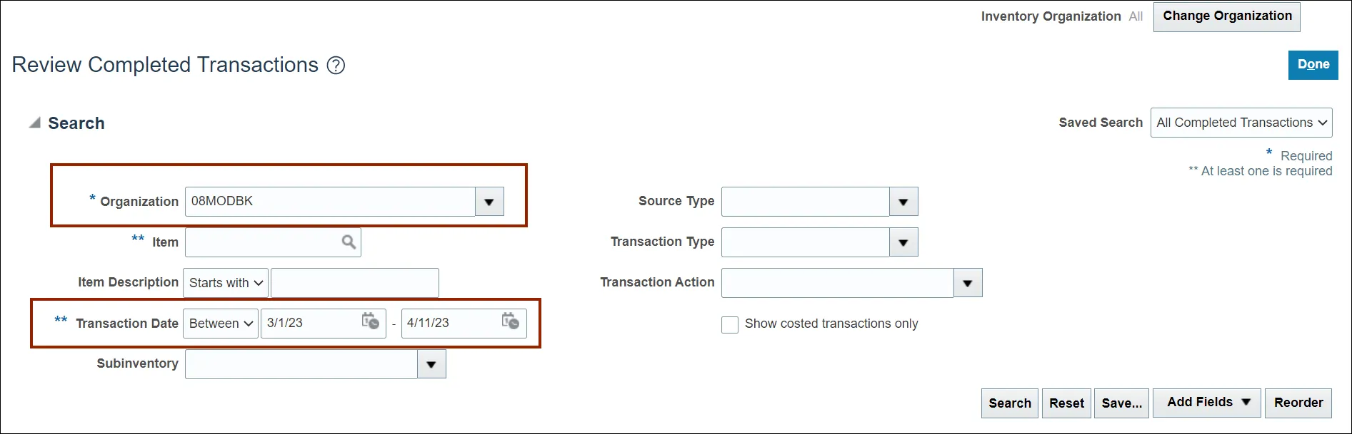 Step 6. On the Review Completed Transactions page, enter the Organization field, and any fields marked by**.