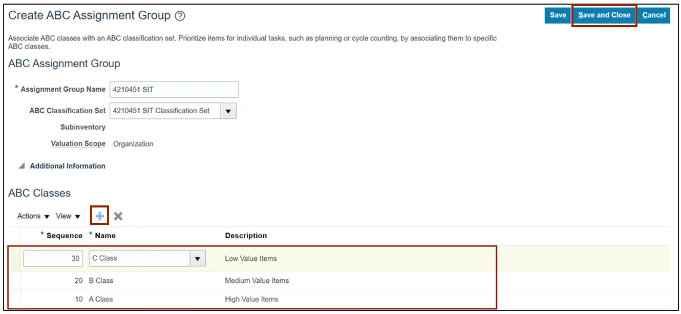 Step 6.    On the Manage ABC Classes page, click the Add Icon and enter the ABC Class and Description. Click the Save and Close button.