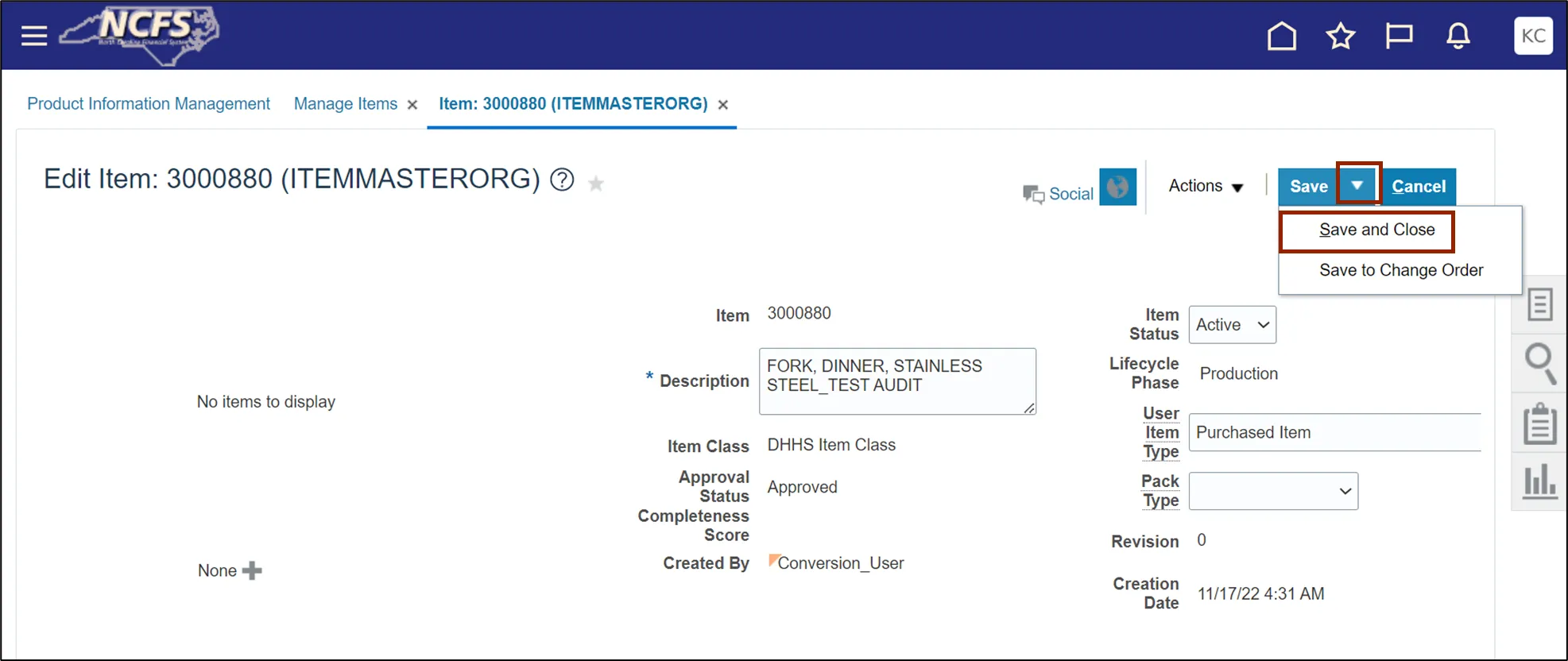 Step 11.    Click the Save drop-down choice list and select Save and Close.