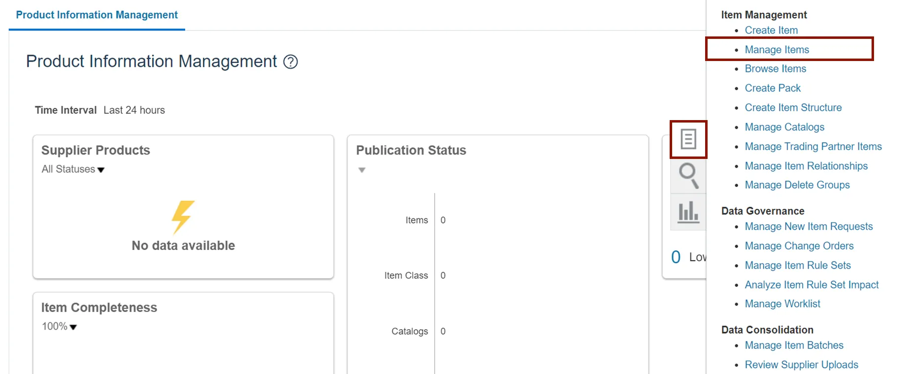Step 3.    On the Product Information Management page, click on Tasks icon and click Manage Items.
