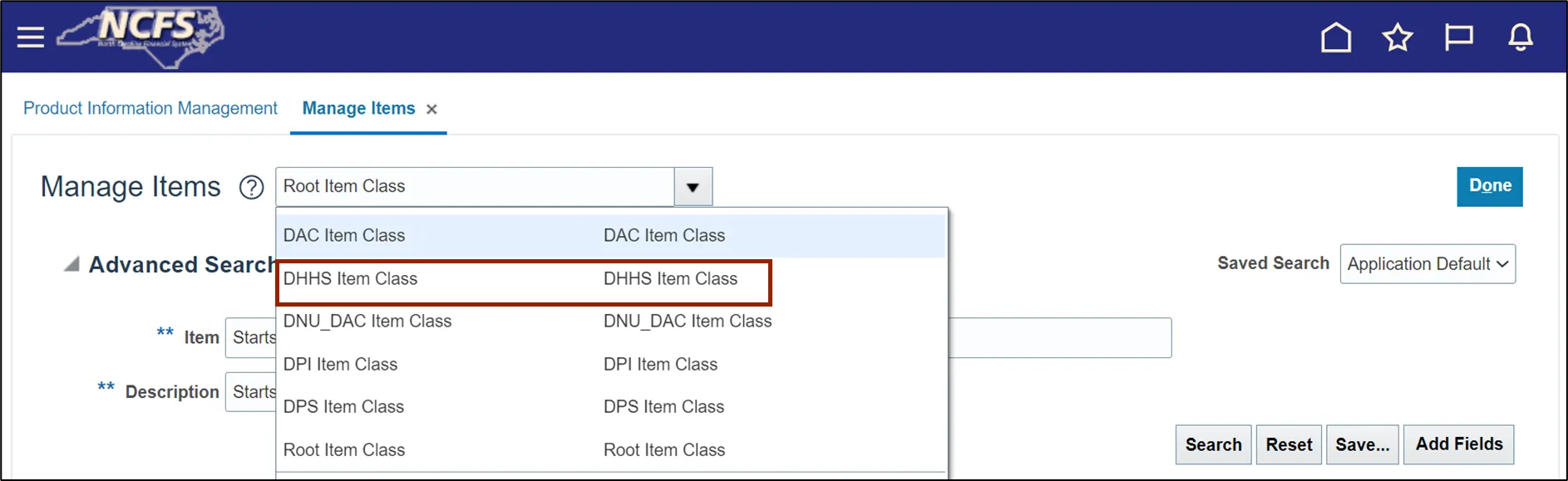 Step 4.    Select the required Root Item Class. In this example, we choose DHSS Item Class.