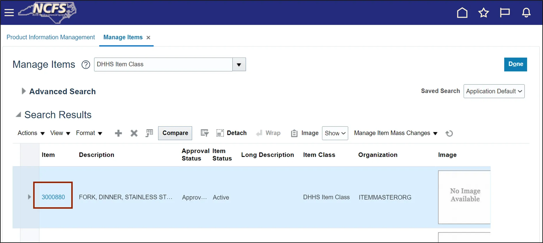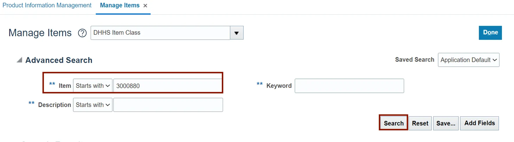 Step 5.    On the Advanced Search section, enter the Item number and click the Search button.