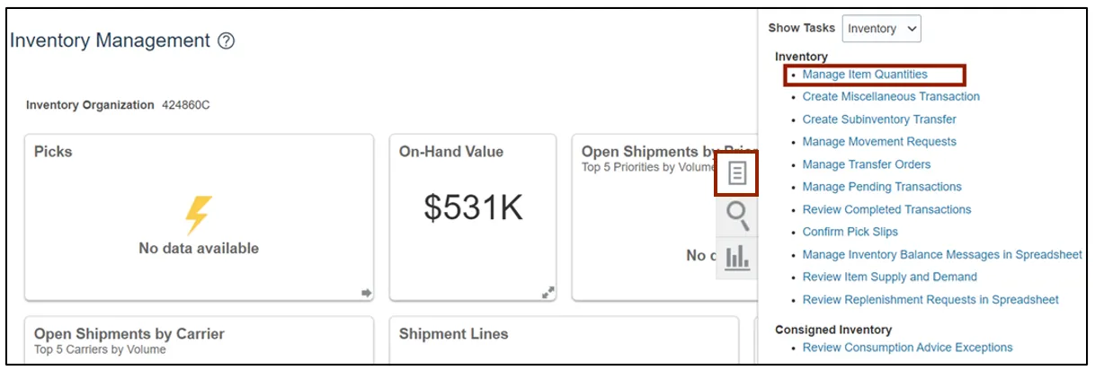 Step 4. Click on the Tasks icon. Under the Inventory section, click Manage Item Quantities.