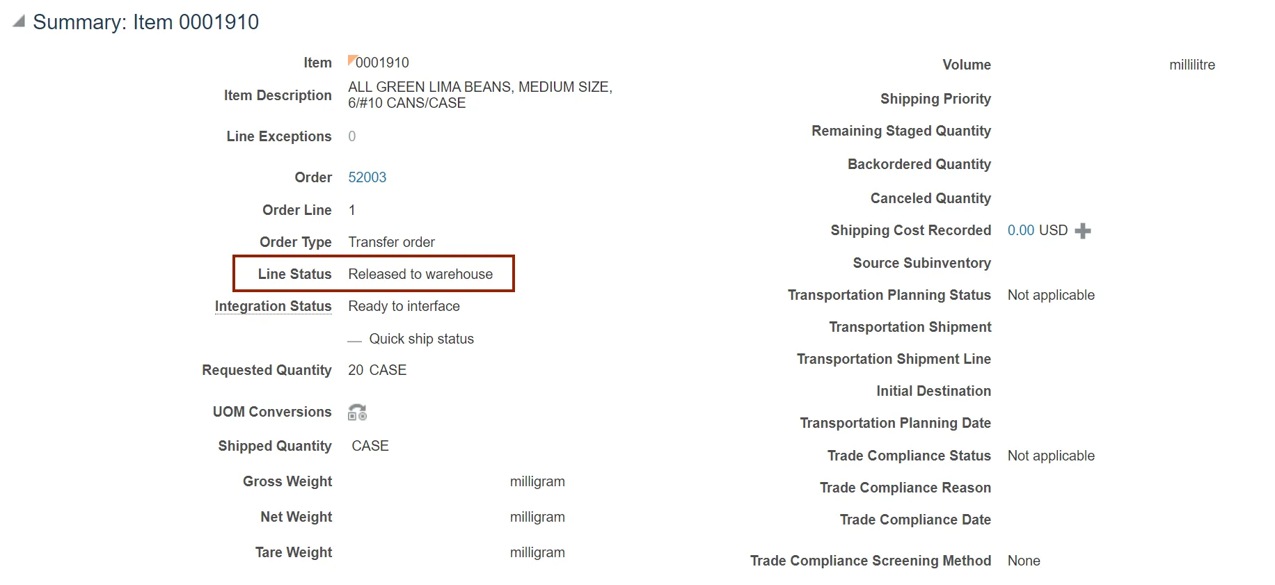 Step 11. Verify that the Line Status is Release to Warehouse.